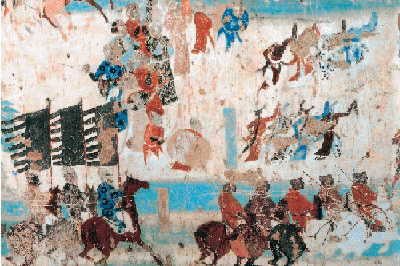 After this, in the centre ride two horsemen holding what are probably honorific parasols wrapped up in blue sheaths. Behind them in diamond formation are four horsemen holding whips, labelled as a "mounted advance guard", and a platoon of eight men on foot called "Officers of the Silver Knife". Two other cavalrymen follow, turning back to watch over their commander, Zhang Yichao, who is impressively depicted in a larger scale. Riding a white horse, whose bridle is held by two men, he is about to ride across a bridge. The large cartouche here announces that this is the "Picture of the procession of the Commissioner for Hexi, Controlling Officer and Imperial Censor, Zhang Yichao, organizing an army to expel the Tibetans and restore [Chinese rule in] the Hexi Road". The two cavalrymen holding whips who ride just behind him are identified in the cartouche above as: "sons and younger brothers in the army". Beyond this point, at the far left of the south wall, the procession continues, but has suffered some damage through blackening by fire. There are further cavalrymen with lances, and two holding a ceremonial fan and a large red standard, similar in design to the standards at the beginning of the procession. The last part of the picture, on the southern part of the east wall, is less formal: hunters at a gallop shooting deer (pls 321, 322) and, bringing up the rear, a camel and mules serving as pack animals. These last scenes once more recall the wall paintings in the Tang imperial tombs, especially those in the tomb of Prince Zhang Huai (dated 706) where camels with saddlebags follow the main body of riders in a hunting scene...