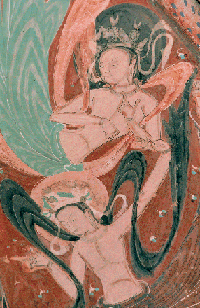 ...The programme of the west wall (pl. 42) is perhaps the most complex and diverse of all the Dunhuang caves. The central niche is fully 1 metre deep, 2 metres wide, and 2.6 metres high, but its apparent height and width are greatly increased by the lintel above, which extends on to the west slope of the ceiling, where monkeys play among the hills (pls 282, 283). This lintel is filled with scrolling half-palmettes and lotus blooms, alternately red and blue, inverted and right way up, each with a small figure representing a Bodhisattva newly reborn by transformation (pl. 211). Within this niche, the main image is seated with legs pendent (pl. 43). The Buddha's robe gives a glimpse of the fastening of his inner garment, and hangs over the throne and his legs in raised spiral folds which are consummately modelled. It ends in elegant points at the Buddha's left shoulder. The halo and aureole are wholly composed of up to six different kinds of flame borders, perhaps the most elaborate from the entire site. Similarly, the rows of adoring Bodhisattvas, slim and beautiful, with haloes all of different colours, show the highest level of skill (pl. 242). At the top of the niche, four apsarasas or heavenly beings exemplify this artistry; they are drawn with fine ink lines, colour shading of the contours, and fine white highlights, their graceful antics neatly filling the curved surface and directing attention back to the Buddha (see detail below)... | |