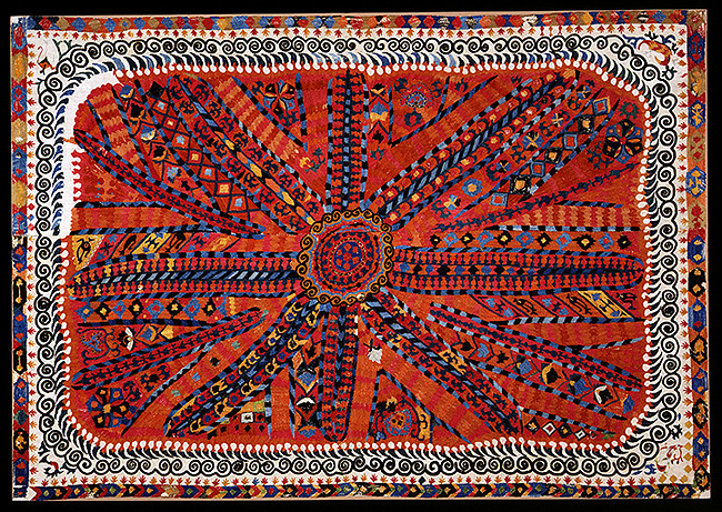 Design type B Giant rectangular medallion filling the field; single narrow border. Three examples known, all nim-suzani. | ||