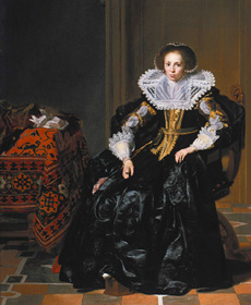 Examples from the first period with centralised or so-called 'double-niche' designs, on which many of the motifs are mirrored vertically and horizontally, are even rarer than those with single niches. The majority of known examples may once have been in the churches in Transylvania, although only one survives there today, in the Black Church in Brasov. As with the single-niche rugs, they all have slight variations in their field designs but also form a close-knit group. They all have similar stylised floral sprays in their spandrels, and they have a large lamp hanging at each end of the field. In Thomas de Keyser's Portrait of an Unknown Woman, 1632, in the Gemaldegalerie, Berlin, the narrow chain guard border is on both sides of the main border, the spandrels are light and the field is dark, similar to this Budapest rug. The de Keyser rug has just the star design in the border, without the cartouche. This border is unusual but not unknown - one such rug is in the Black Church in Brasov and another in the Evangelical Church in Biertan.