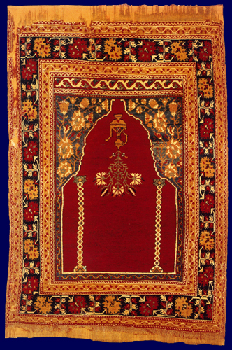 36 The Brukenthal Two-Column Niche Rug Dominating the deep red field are two columns with stars at their bases and small capitals. A large ewer in the niche, with a stem of three carnations and two tulip-like buds, points 'downwards', but in the direction the rug was woven. The two spandrels are joined around the sides and bottom of the niche by a stem, making it appear as if the red niche 'field' is lying on top of a second, floral 'field' on mid-blue. The primary border is composed of an ivory stem decorated with alternating red and gold flowers against a dark blue background. The outer and inner guard borders are the same and both are flanked by narrow bands. | |||