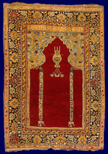 37 The Sebes Two-Column Rug The deep red field is interrupted by two columns, each with a ewer placed upside-down at the base. In the mihrab is a hanging lamp or vase, with three short chains; from the lamp emerges a stem with a carnation and two tulip-like buds that point downwards, in the direction the rug was made. As with the previous example (exhib no. 36), the spandrels are joined by a stem, as if to create a second, underlying field. In the panel above the spandrels are three cartouches with stylised Kufic script. | |||