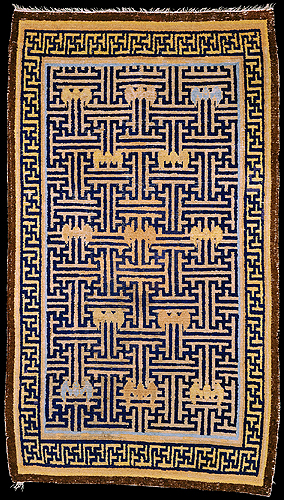 41 The Cagan swastika lattice and bat seating mat This large seating mat has a characteristic Kangxi carpet design of a swastika trellis pattern covering the entire field, overlaid with small bats placed symmetrically in offset rows. Originally the background was dark red, but this has mellowed to a reddish-tan colour. The bats are portrayed in a variety of single colours, and outlined in a second. Narrow bands in light blue, reddish-tan and red surround the field. The single swastika fret border in dark blue is set against a yellow background. The use of the overall swastika design resembles lattice patterns that occur throughout the arts of China in infinite variety; the bats are placed in regular order in a manner reminiscent of textile designs. The swastika lattice pattern is a symbol of good health, the swastika itself being styled the 'ten thousand character sign', or wan zi. Bats (bian fu) are a prominent design motif in Chinese art, symbolising longevity and happiness - the character for 'happiness' is also pronounced fu. The swastika in combination with bats, wan fu, thus carries the message 'ten thousand times happiness', or 'may you have happiness for ever!'. The swastika lattice and bat design survives on less than twenty Kangxi carpets, almost all of which date from around 1700 or a little earlier. Two of them are in the Metropolitan Museum of Art, New York. This large seating mat, in full pile with fresh colours, displays the true splendour of the design. While the scheme continued to be used in later periods, the swastika trellis was relegated to being used as a relatively weak background decoration, and often - most unluckily - without bats. |
