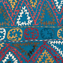 The design bravado of the embroideries, with their shimmering colour density and the assured juxtapositioning of colour and texture gives them a contemporary significance. The designs have a confidence and verve which evoke a sense of recognition and pleasure in an audience far removed in history and culture from their original owners, to whom they were evidently of powerful totemic significance. Indeed, the more abstract among the embroideries stand on a par with the work of 20th-century Western masters such as Klee, Miro and Matisse. | |