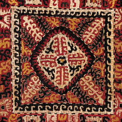 THE DESIGNS The vast repertoire of designs is the legacy of the history of the region and the multi-religious society that produced them. Byzantine, Fatimid, Mongolian, Timurid, Mamluk, Chinese, Ottoman and Celtic forms, many of great antiquity, combined with local animist art in a glorious diversity: hieroglyphic motifs, sun signs, birds signs, sun bursts, octagons, cosmic columns, horns, crosses, fantastic crab-like beasts, elk, reindeer, fat swordfish, dragons, amoebae-like shapes, masks and even foetuses can be identified. Many ancient talismanic symbols occur, for these panels were used in rituals associated with birth, marriage and death - to wrap cradles or as dowry covers, for example. A number of the motifs can also be found on local tombstones. |